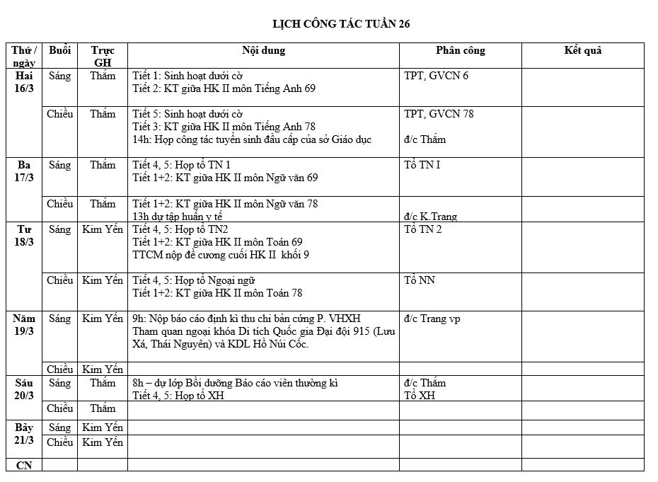 LỊCH CÔNG TÁC TUẦN 26