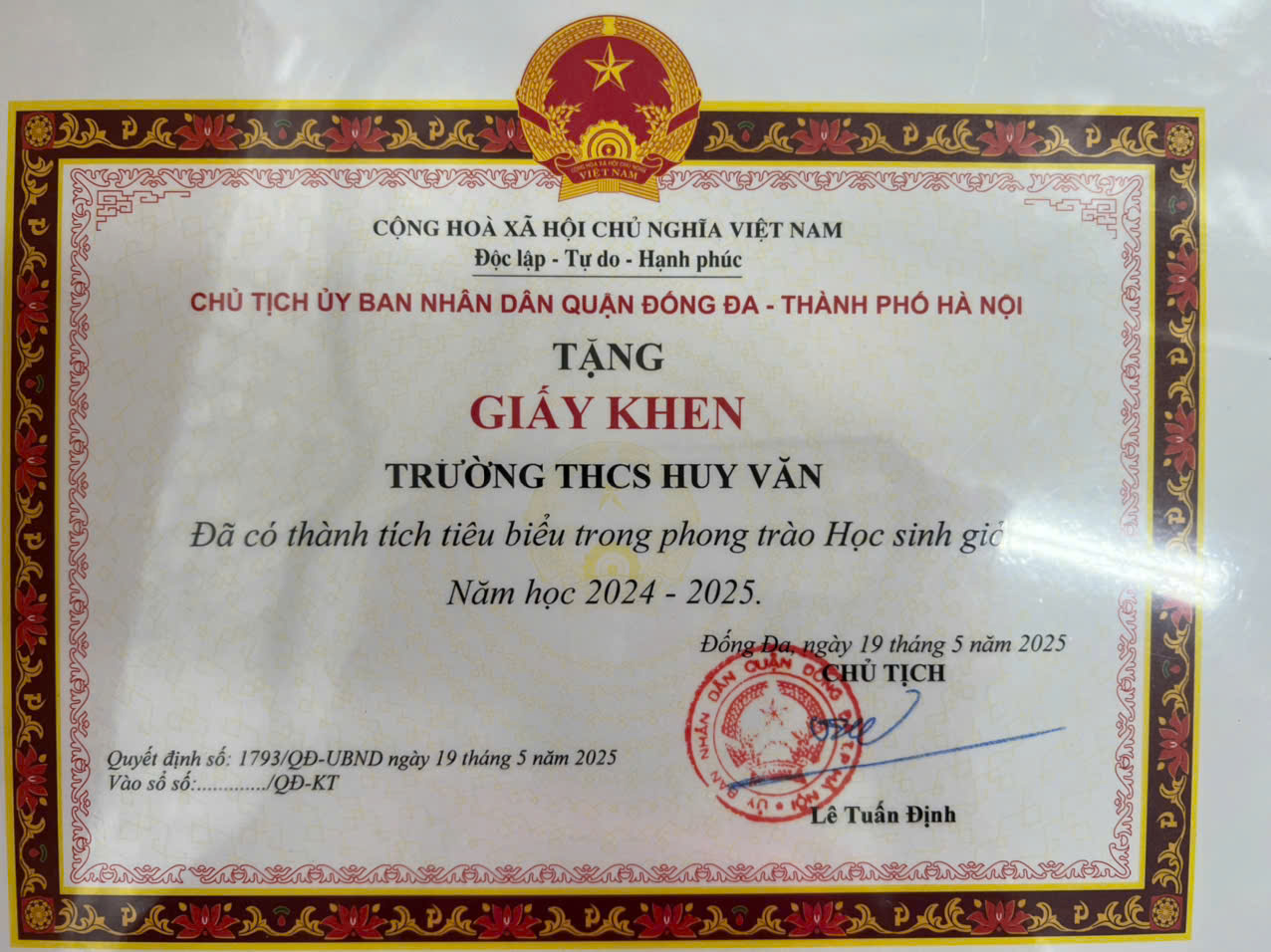 Với sự nỗ lực, cố gắng của thầy và trò, sáng nay 27/5/ 2025, trường THCS Huy Văn là một trong các trường được UBND Quận khen vì có thành tích tiêu biểu trong phong trào Bồi dưỡng học sinh giỏi năm học 2024 – 2025. Trân trọng cảm ơn các bậc phụ huynh đã luôn đồng hành cùng thầy trò nhà trường. Mỗi phần thưởng hôm nay là một dấu mốc đáng nhớ, là động lực để trường THCS Huy Văn tiếp tục bước đi, kiên định trên hành trình trồng người đầy gian nan nhưng cũng vô cùng vinh quang. Huy Văn – nơi gửi gắm niềm tin cho những ước mơ bay xa!